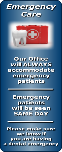One of our doctors is on-call 24 hours a day, seven days a week, 365 days a year. If you are having a dental emergency, just call either office and our voicemail system will direct you with how to leave a message for the on-call doctor. Emergency calls will be returned with a few minutes whenever possible.